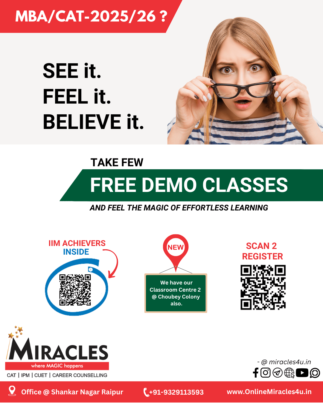 MIRACLES is India's best offline & online CAT, IPM, CUET coaching. It's the only institute that provides nationwide Mock Test Series for IPMAT with video solutions. Our Current Affairs including GK as per the latest pattern of CMAT, CUET, SET can be regarded as the top class content for any career aspirants.